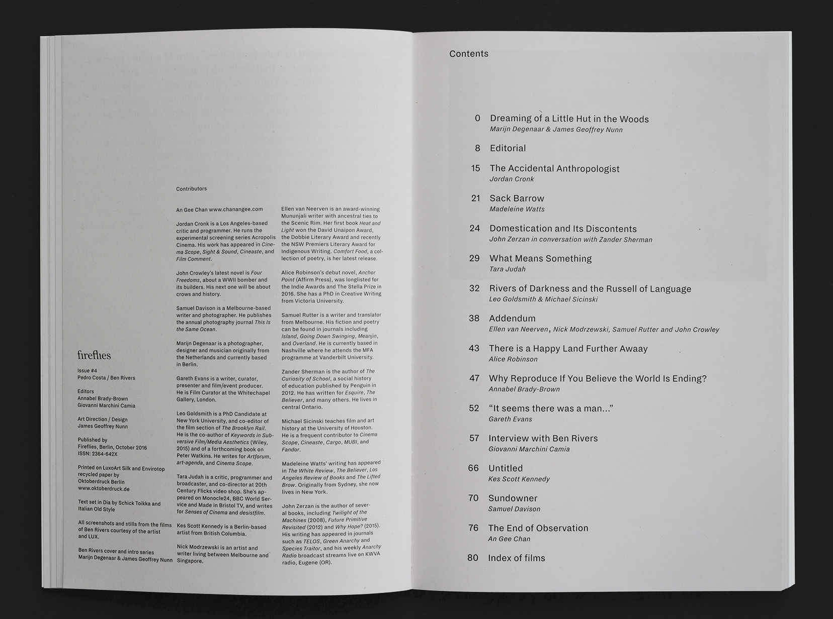 Original contributions by Annabel Brady-Brown, An Gee Chan, Jordan Cronk, John Crowley, Sam Davison, Lucas de Lima, Gareth Evans, Rebecca Foust, Leo Goldsmith & Michael Sicinski, Tara Judah, John Karborn, Kes Scott Kennedy, Alena Lodkina, Susana Moriera Marques, Adrian Martin, Edward McAliece, Nick Modrzewski, Max Nelson, José Neves, James Geoffrey Nunn, Adam Rivett, Alice Robinson, Samuel Rutter, Zander Sherman & John Zerzan, A.L. Snijders (translated by Lydia Davis), Andrej Ujhazy, Ellen van Neerven, Madeleine Watts and Moira Weigel.